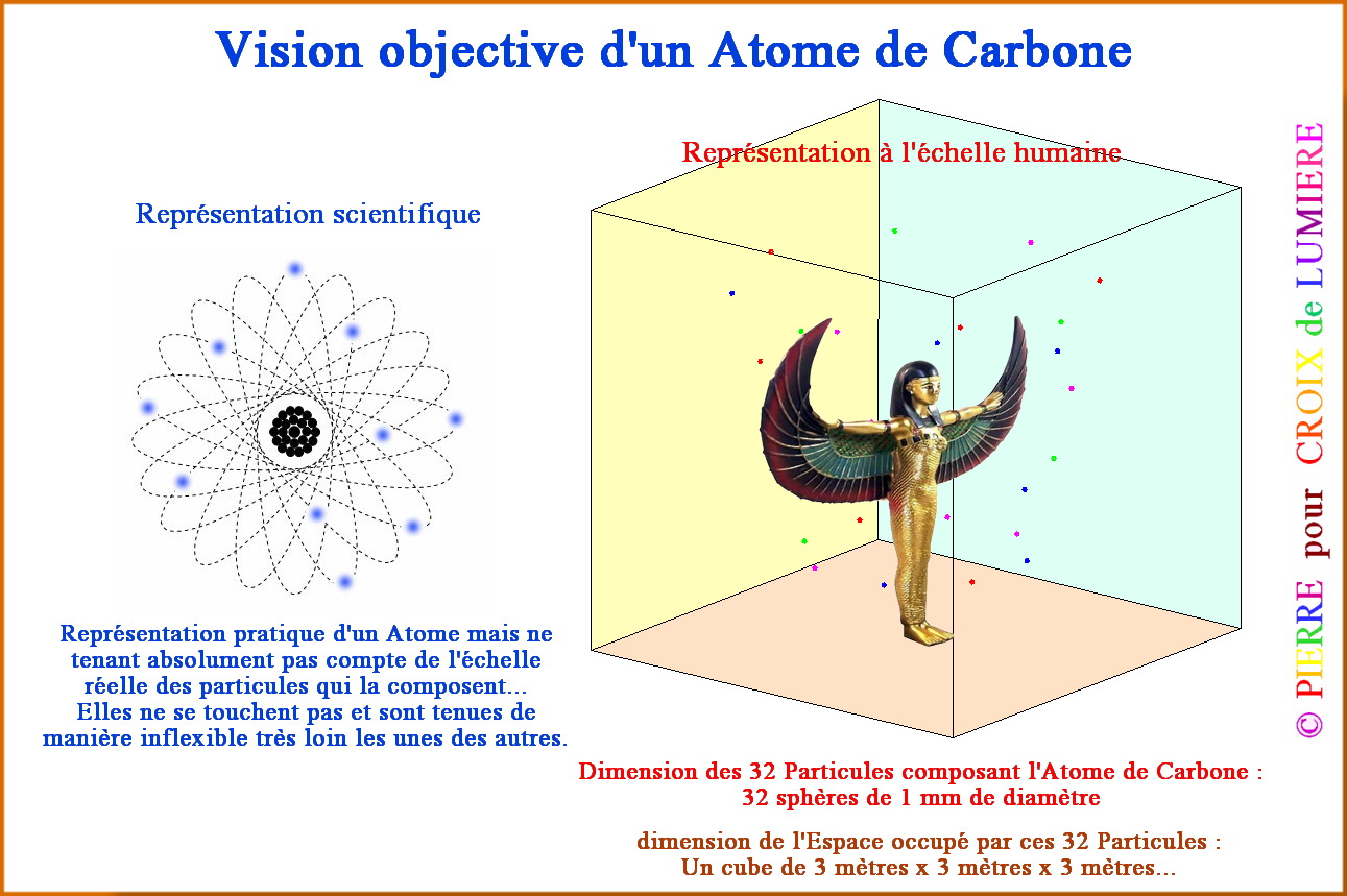 Ils lui expliquèrent à quoi ressemblait vraiment un atome de Carbone… Composé de 32 particules, Pierre croyait qu'elles se touchaient mais grâce aux forces électromécaniques faibles, les particules se tiennent toutes à une distance très importante les unes des autres. Si on voulait agrandir un atome de Carbone pour le rendre visible, on pourrait le comparer à 32 granules homéopathiques de 2 mm de diamètre seulement, bien sûr l'espace occupé doit lui aussi être agrandi dans la même proportion et il formerait alors un cube de 6 mètres de côté. Il est facile de calculer qu'un volume de 216 m3 représente une surface de 83 m2 si on est dans un logement normal.