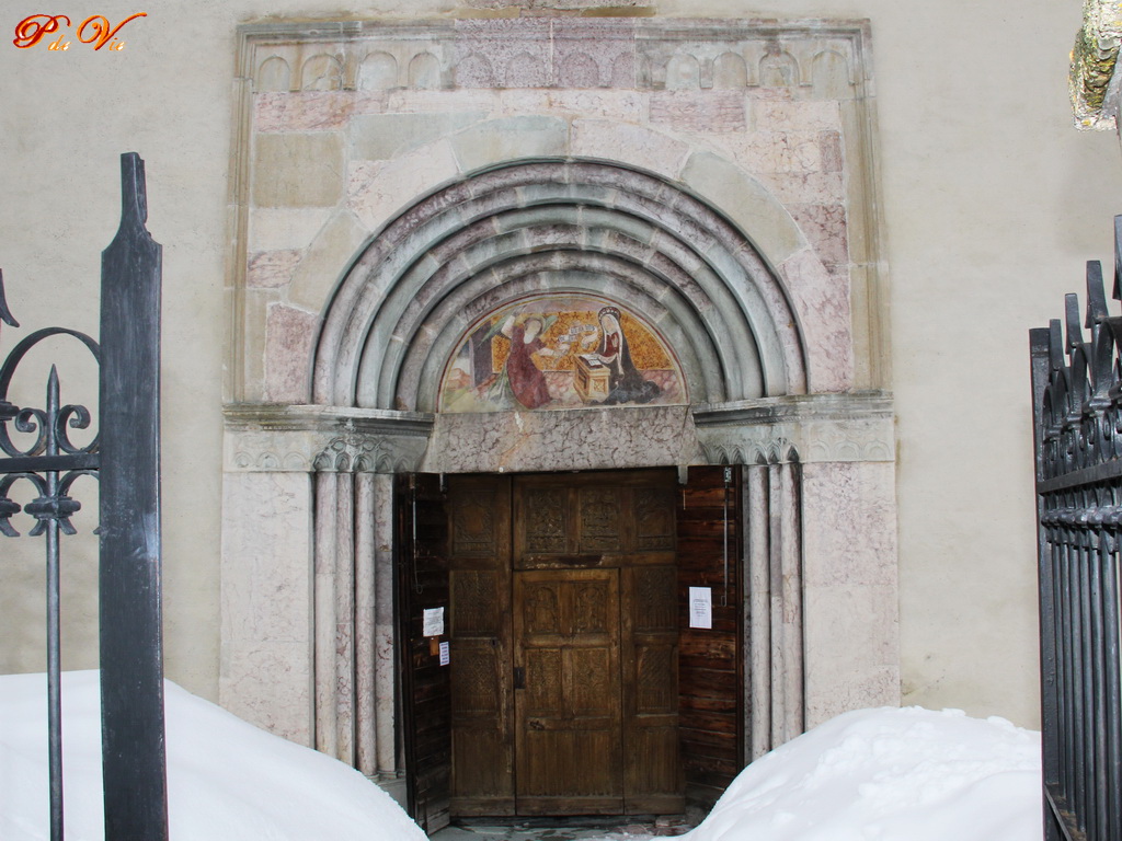 L'encadrement se termine par un bandeau d'arcatures, des petites arcades, à cintre brisé qui alternent quatre sections carrées avec trois sections rondes. Le tympan est décoré par une très belle fresque qui représente l'Annonciation mais dans une version qui demande une grande attention. Détail de cette fresque à la page 24…