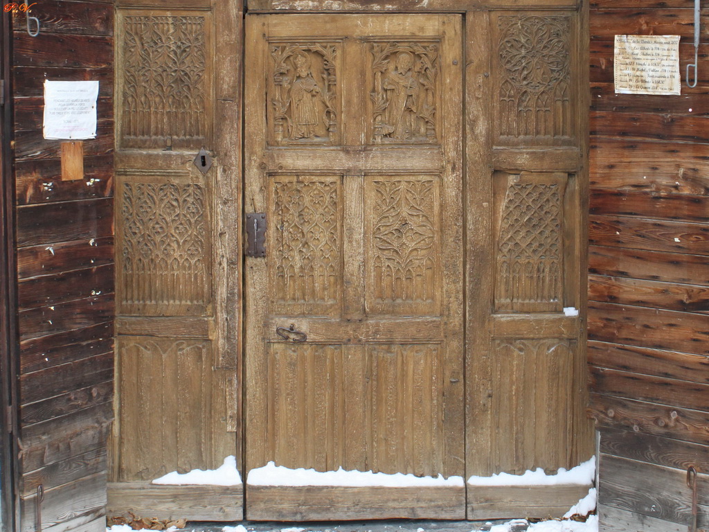La porte centrale est décorée de six panneaux, les deux du haut représentant les deux patrons de la paroisse de Névache, saint Antoine à droite et saint Marcellin à gauche. Quiconque pousse cette porte et en franchit le pas à la possibilité de se placec sous la protection de l'un de ces deux saints patrons. Une simple émotion suffit pour cela...
