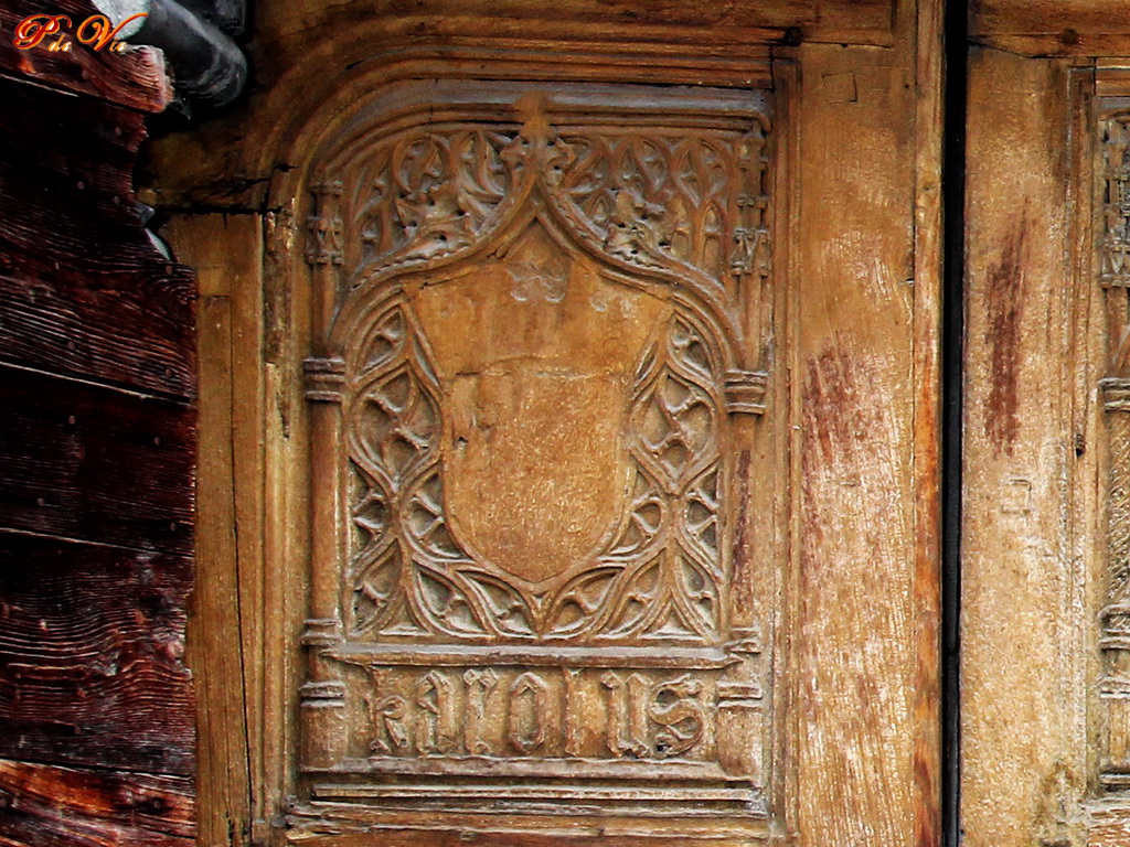 Dans l'angle supérieur gauche de la grande porte Ouest, le blason du Roi de France, Karolus ou Charles VIII, avait été sculpté pour indiquer que cette église était placée sous sa royale protection. Petit détail, ce blason était décoré d'une couronne fleurdelisée ouverte et a été utilisée de 1372 à 1515. François 1er la fit fermer pour son règne et elle fut conservée ainsi jusqu'à la révolution française.