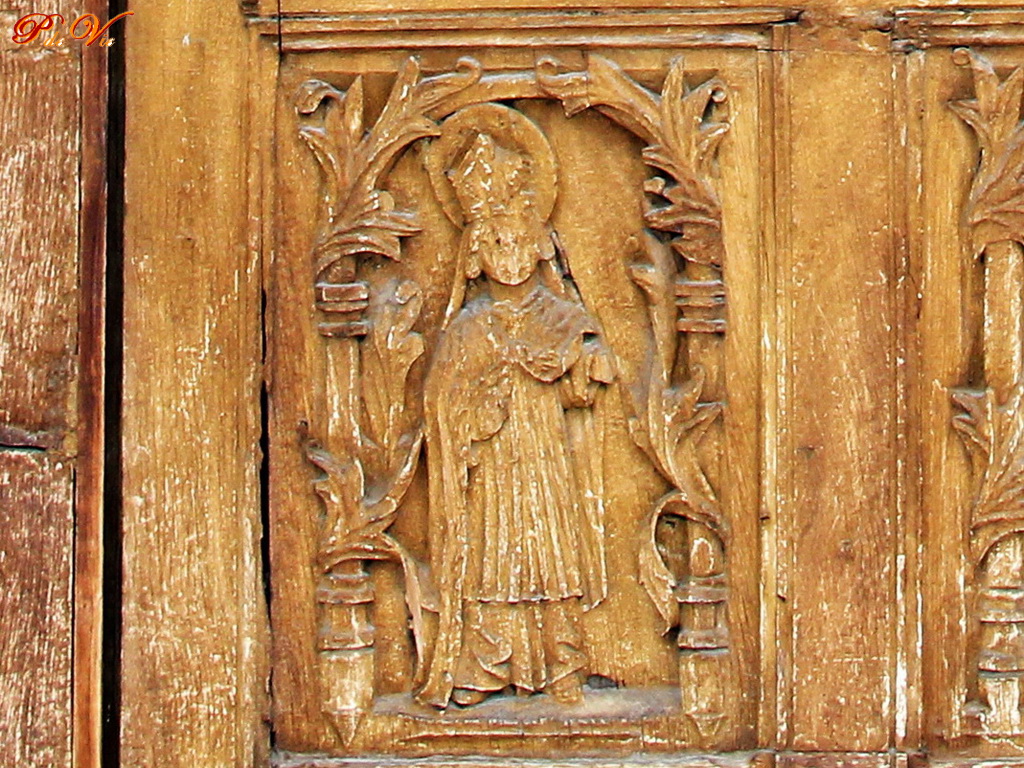 Ce panneau représente Saint Marcellin, que l'on fait passer pour le premier évêque de la ville d'Embrun. Né en Afrique, il se serait embarqué à l'insu de ses parents et il arriva à Rome. Le Pape l'adressa à Eusèbe, évêque de Verceil, qui, tout en lui annonçant d'avance tout ce qu'il aurait à souffrir, l'exhorta fortement à s'acquitter avec courage de sa pénible mission. Saint Marcellin franchit les Alpes et arriva à Embrun.