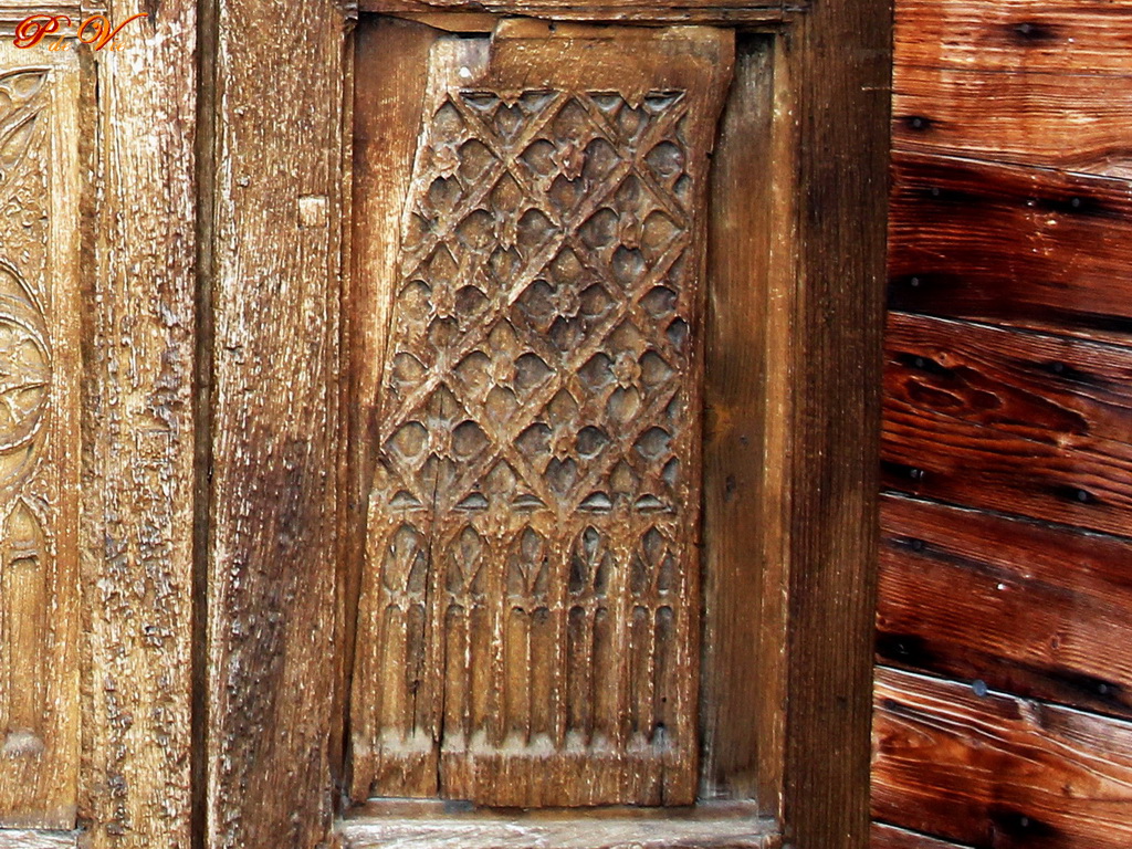Dans l'ensemble, il y a un quadrillage très rectiligne et Pierre en est très surpris. Au centre de chaque trapèze se trouve aussi une fleur quadrante que Pierre n'arrive toujours pas à détailler, cela fait quand même plus de cinq siècles que cette porte est exposée aux intempéries. Par rapport à la porte de gauche, il y en a beaucoup moins, pourquoi ? Dans le nombre de fleurs, qu'est-ce qu'il y a de cacher ? Dans la partie basse, il pense que ce sont de nouveau des piliers qui représentent le monde humain tandis qu'au-dessus se trouve le ciel et ses étoiles !!!