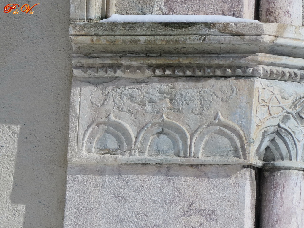 Cette photo montre l'entablement gauche extérieur de la porte Ouest, la porte destinée aux fidèles. D'après l'abbé Romagne, la forme qui se trouve dans le haut de la fresque sur presque toute la largeur représenterait un animal qui a été gratté lors de la révolution française. Pierre ne croit pas que ce soit un animal à cause de la faible hauteur du corps par rapport à sa longueur ou alors ce serait un reptile. Il ne peut s'agir que d'un oiseau aux ailes très largement déployées. Avec ce qu'il a découvert, il pense que les deux "queues" sont les extrémités d'un "drap" que cet oiseau porterait autour de son cou.