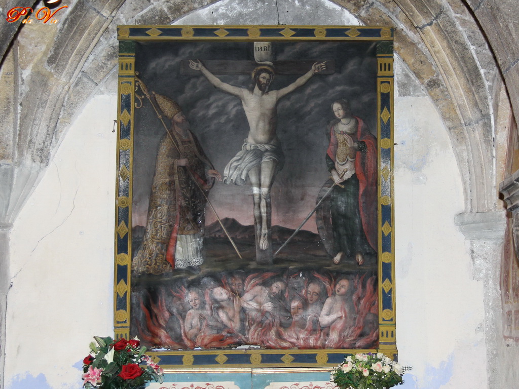 Jésus crucifié sur la croix et l'espoir de renaitre à tous les personnages encore enfermés dans les ténèbres ! Ce tableau n'est pas anodin et mérite d'être bien observé. À gauche se trouve un évêque qui tient sa crosse, objet qui sert encore aujourd'hui à attraper un mouton par une patte. Il tente d'attirer le regard de Jésus mais ce dernier préfère se tourner vers une femme qui est décidée de se battre pour lui. C'est Jeanne d'Arc qui tient fermement son épée, la pointe touchant la croix et indiquant ainsi sa soumission complète…