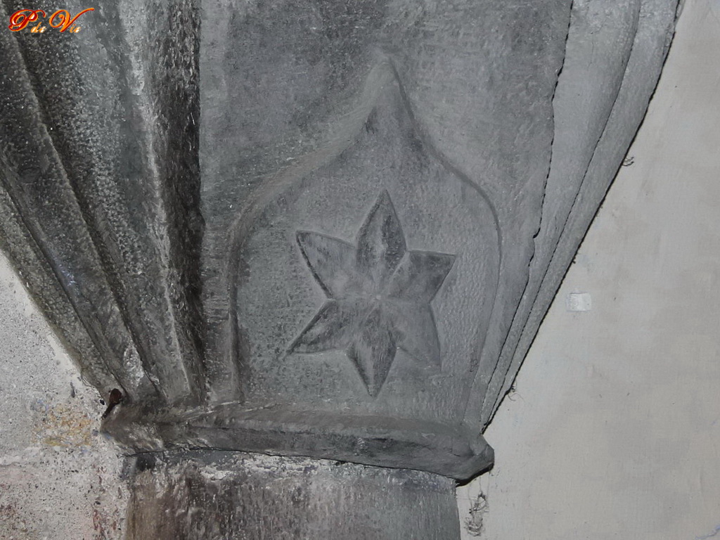 Cette Étoile de Mariam est sculptée sur le pilier qui sépare les deux chapelles au niveau des autels. Cette position centrale nous indique que l'autorité spirituelle des Sœurs de Mariam prévalait sur celle de saint Antoine que vénérait la communauté des Antonins. |