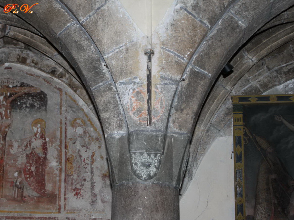 Cette photo montre le pilier placé à l'avant des deux chapelles. La barre de fer n'est qu'un renfort qui empêche l'écartement des murs des deux chapelles. Le symbole orangé placé derrière est une croix cathare utilisée pour la dédicace de l'église par l'évêque et qui doit être refaite tous les 100 ans. Quand c'est le cas, un marquage à la peinture rouge-orange est pratiqué en 12 points répartis dans l'église...