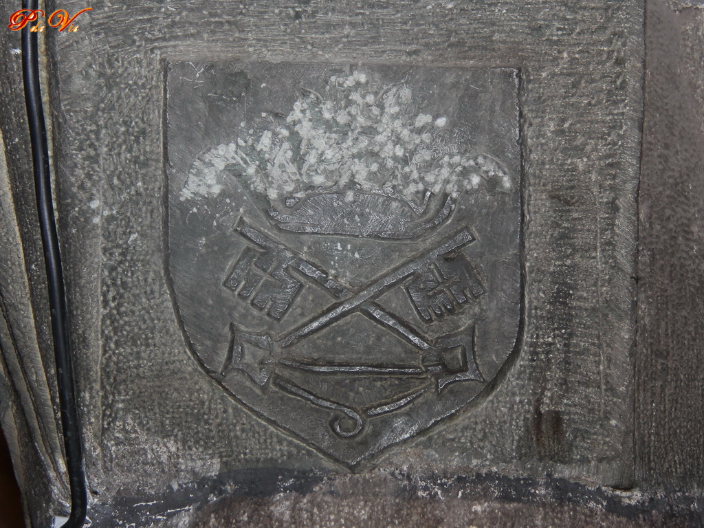 Placé du côté Nord, sur le pilier placé entre les deux chapelles, ce blason représente dans le bas les deux clés croisées reliées par une cordelière et provenant du blason des papes. Au-dessus se trouvait la couronne fleurdelysée ouverte de la royauté française. A lui seul, ce blason, très abimé lors de la révolution française, indique que cet espace est placé sous la double protection du pape et de celle du roi de France…