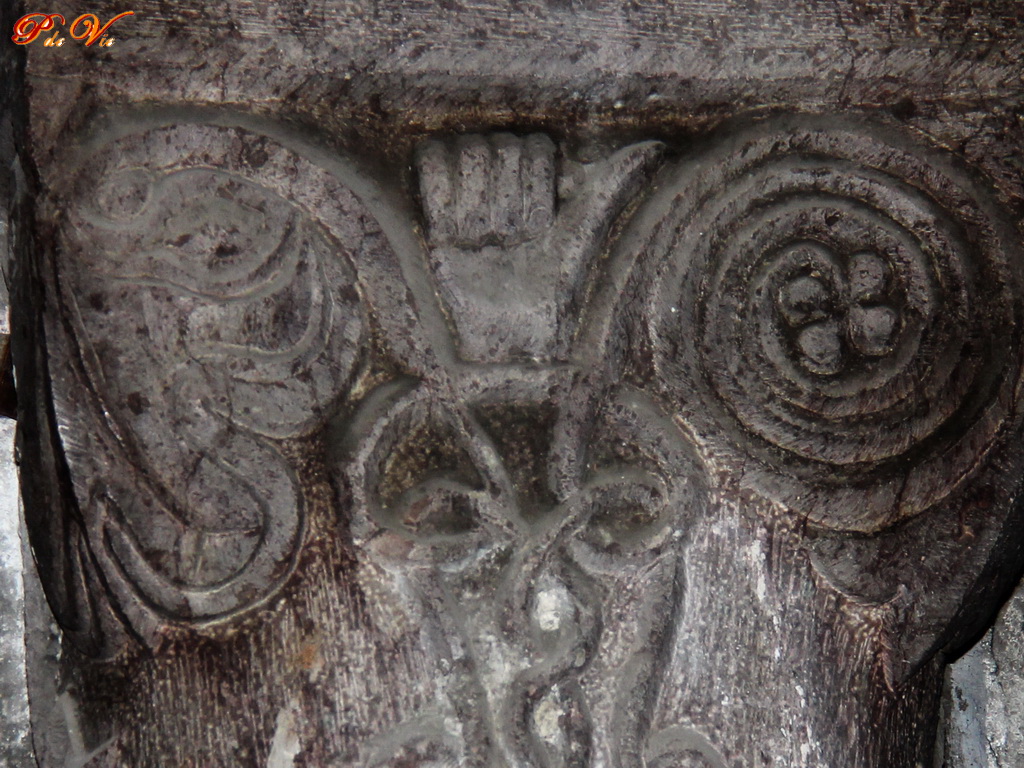 Sous la main, on voit une cordelière nouée et de part et d'autre, deux enroulement contenant chacun un motif différent, un trèfle d'un côté mais un gros mystère de l'autre. Intuitivement, Pierre pense que l'un des symboles serait en lien avec la royauté française tandis que l'autre serait en lien avec un des papes de cette période.