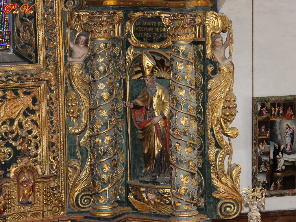 Dans cette vue latérale du Retable, vous pouvez observer le pylône de droite, lui-aussi formé de deux grosses colonnes torsadées entre lesquelles se trouve une statue de grande taille de l'archevêque de Gap.
