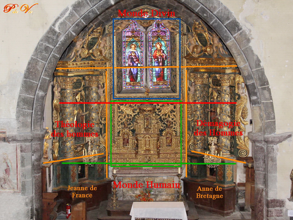 Pierre a partagé le Retable en plusieurs zones. En haut, au niveau des corniches des deux pylônes latéraux se trouve le Monde Divin, sous cette ligne orange, le Monde Humain. Bien que les vitraux ne soient pas d'origine, il est logique de considérer que Marie et Jésus, dans le rectangle bleu, sont des intermédiaires privilégiées présents dans les deux mondes.