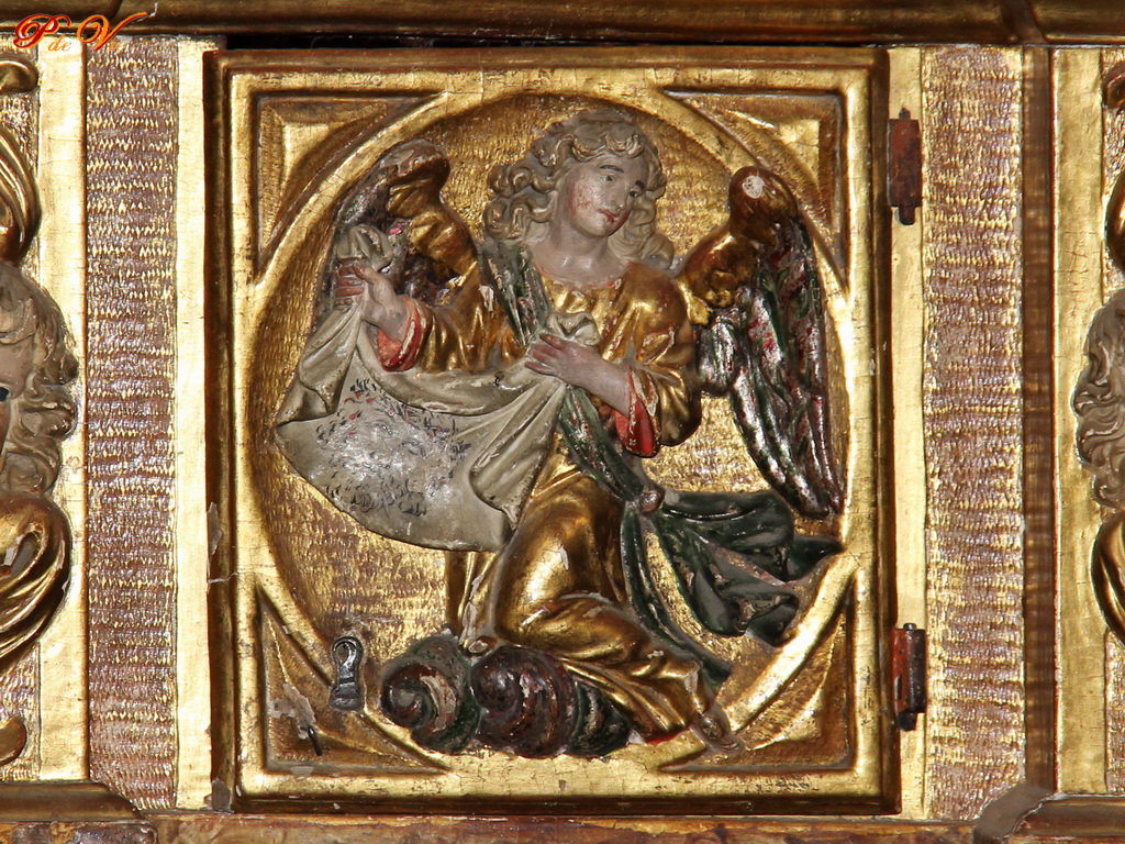 Cette sculpture se trouve sur la porte du premier tabernacle, mot dont l'origine du nom provient de l'Égypte antique. Dans les temples se trouvait toujours un petit coffre sacré appelé Naos duquel un prêtre ou une prêtresse sortait chaque matin la statuette représentant la Divinité féminine du lieu afin qu'Elle puisse être active toute la journée. Elle y était réintroduite à la fin du jour pour La protéger des forces obscures de la nuit...