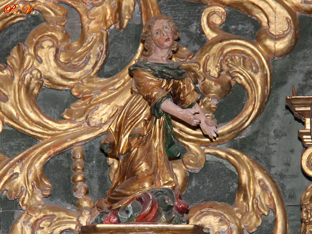 Voici un gros plan de la Sylphide placée à gauche de Marie… Remarquez ses deux bras qui se rejoignent et qui sont orientés vers le bas, mais surtout vers Jésus en croix sur la porte du second tabernacle, tandis que ses yeux regardent entrer les visiteurs et les fidèles de la porte Ouest... |