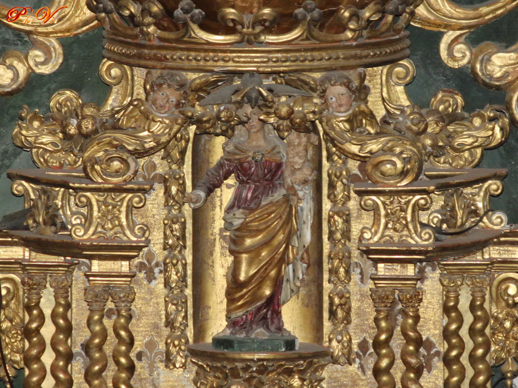 Sous la coupole représentant le Toit du Monde, vous pouvez voir Marie trônant au centre de cet étonnant Retable, portant ou plutôt présentant l'enfant Jésus tout nu à bout de bras...