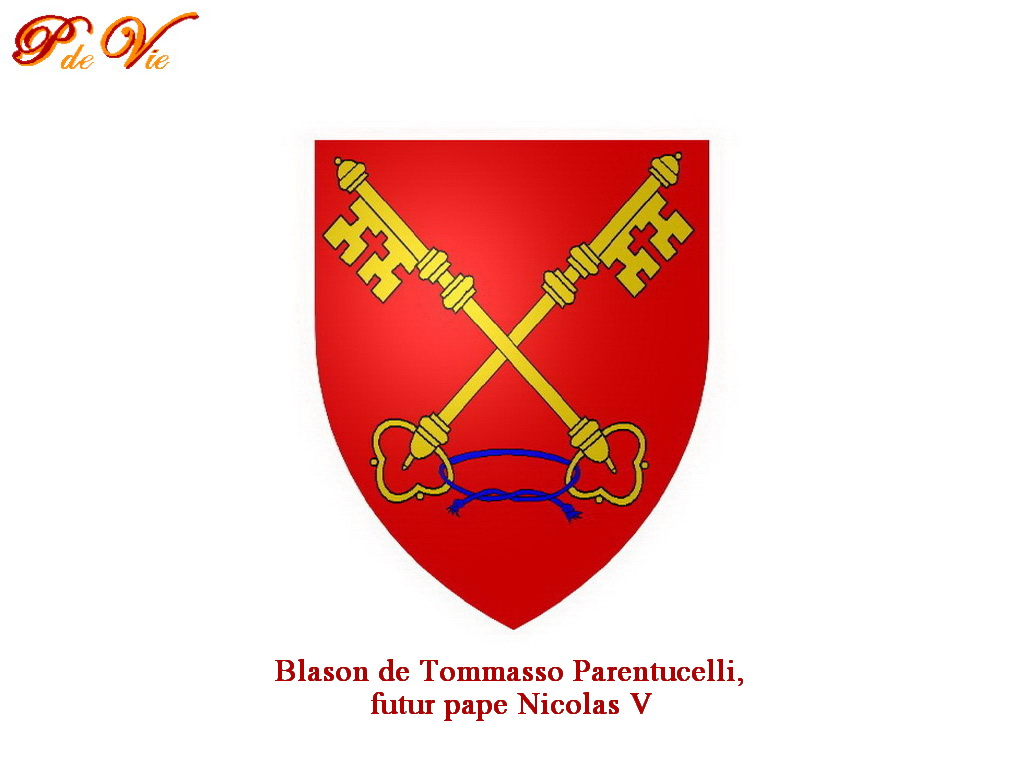 Nicolas V, Tommaso Parentucelli, est né à Sarzana vers 1398. Il devient le pape Nicolas V le 6 mars 1447 à 1455. Il mit fin au schisme de l’antipape Félix V et il fonda la Bibliothèque vaticane. Libre de tout népotisme, son regard perçant engendrait l'obéissance alors qu'il était d'abord un homme de lettres. Son blason personnel est celui du comtat venaisin.