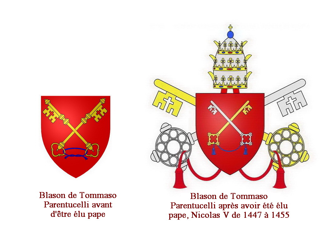 Quand un prélat devient pape, il appose son blason personnel sur le blason du Vatican. En page 102, Pierre vous a présenté le blason du Vatican, en page 103, le blason de Tommaso Parentucelli.